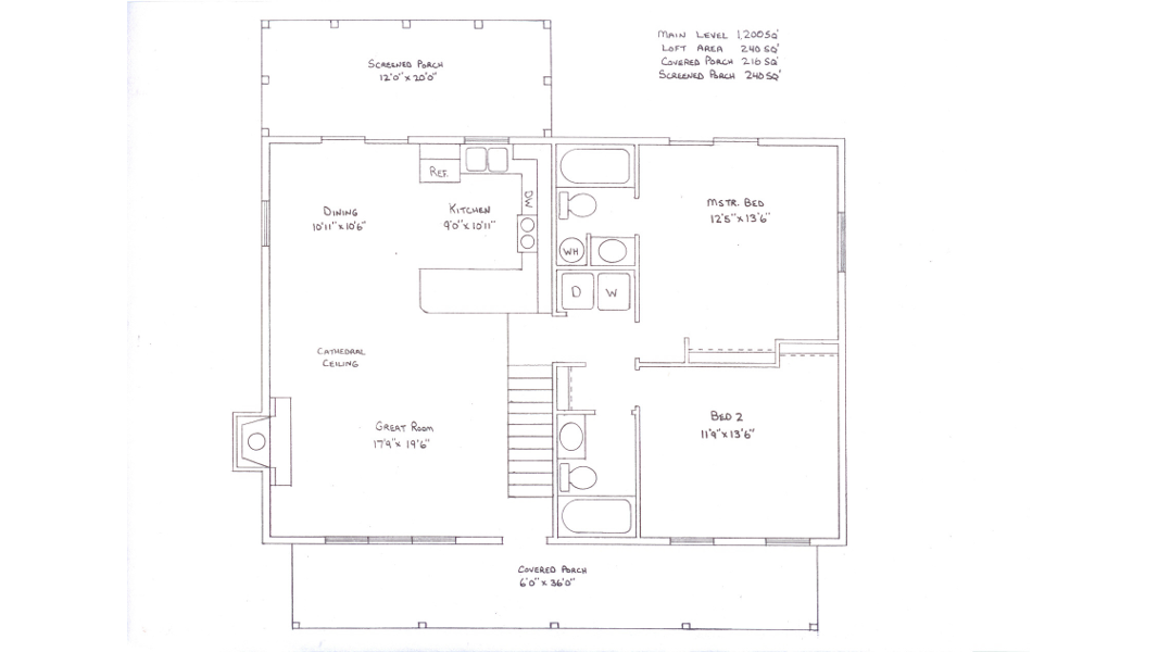 Their very successful new home is just under 2,000 SF in size, completely wheelchair accessible, with 3-foot wide doors, minimum 4-foot hallways, and levers on all doors and faucets. Their home has 3 ample bedrooms, two baths, one of them a commodious master bath, plus a den or office, a large screened porch where they live in summer, an additional grilling deck, a two car garage and a 16′x18′ storage area under the house. Construction is of low-maintenance* aluminum siding and field stone.